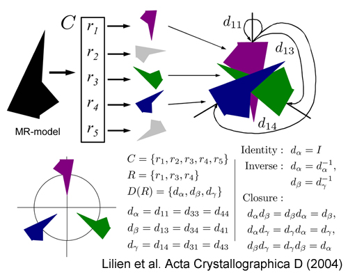 CRANS The core of the CRANS algorithm analyzes the set of rotation differences to identify finite sets of rotations that satisfy the subgroup axioms. Given a set of w cross-rotation peaks (rotations) C = {r1, r2, . . . , rw}, where ri is an element of the group of three-dimensional rotations SO(3), CRANS examines the w2 rotation differences dij where dij = ri−1 rj and ri−1 is the inverse of ri (such that ri−1 ri is the identity). Conceptually, the rotation difference dij is the rotation that rotates the model oriented by rj into the model oriented by ri (Figure). We can test the NCS consistency of a set of cross-rotation peaks by examining their rotation differences and verifying that they form a finite subgroup of SO(3). In the event of missing rotations, the CRANS algorithm completes each partial set of identified NCS-consistent rotations by generating missing rotations with quaternions. Although rotation differences can be computed using a number of rotation representations, we chose to use quaternions because they have a single compact representation with explicit axis and angle components, are easily composed, are free of singularities, and represent a uniform parameterization of rotation space. |