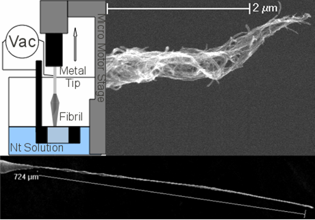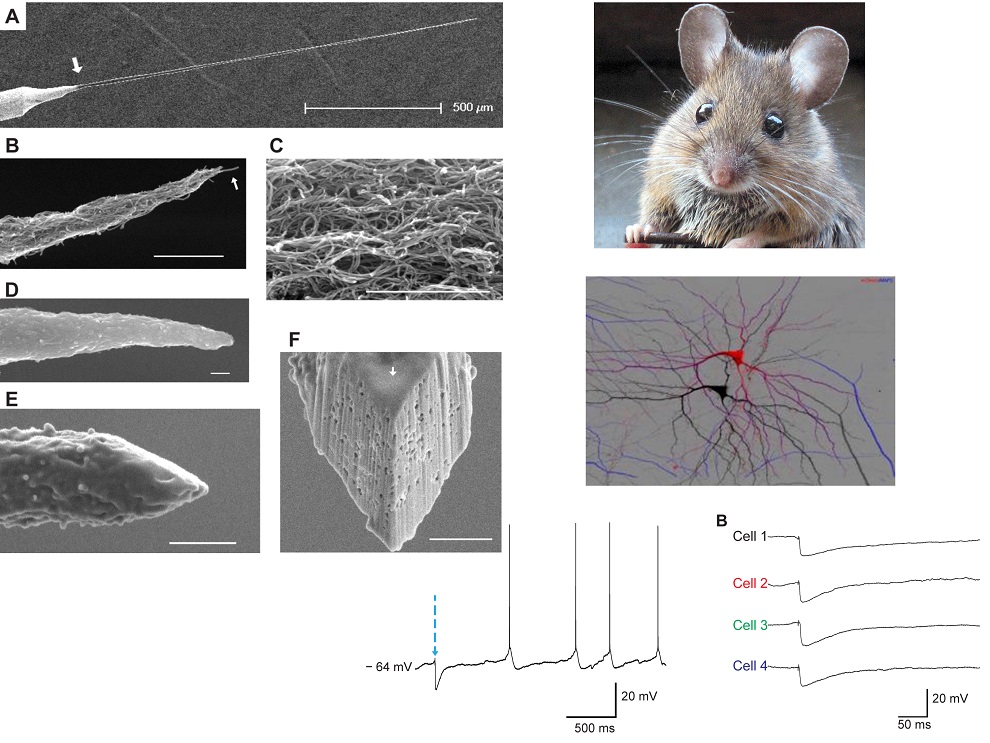 How we perceive and interact with the world depends on the structure and function of the synapses in our brain. Understanding the neural mechanisms of perception and behavior thus rests on measuring the synaptic activity associated with perceptual and behavioral functions. Existing intracellular recording methods are capable of resolving synaptic activity in anesthetized animals, but anesthesia necessarily interferes with perception and behavior. Moreover, the fragility and poor electrical properties of conventional intracellular electrodes render them poorly suited for measuring synaptic activity in the freely behaving animal as it actively engages with its environment. The overarching goal of our research is to develop a novel intracellular recording device using nanotechnology and microelectromechanical systems (MEMS) and to assess its suitability for in vivo intracellular recordings in the freely behaving animal. We work in collaboration with Dr. Rich Mooney (Neurobiology) and Dr. Gleb Finkelstein (Physics).