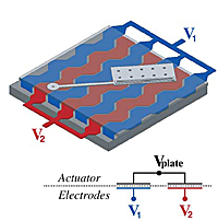 The goal of this research is to build microsystems that can actively, accurately, and efficiently interact and change the physical world. While so far MEMS research has been biased more towards sensor technology, there are a large number of potential applications that require micro actuators. Important examples are techniques to efficiently move, sort, or mix small particles (e.g. cells in biotechnology applications); or micro positioning devices for inspection and assembly of complex micro systems (e.g. for display or amplifier arrays). Here is an article of general interest (PDF) on our work. Our research in this area also includes: