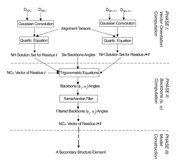beginning with the input RDC data and ideal helix and strand models to a final three dimensional backbone structure. RDCs refer to NH