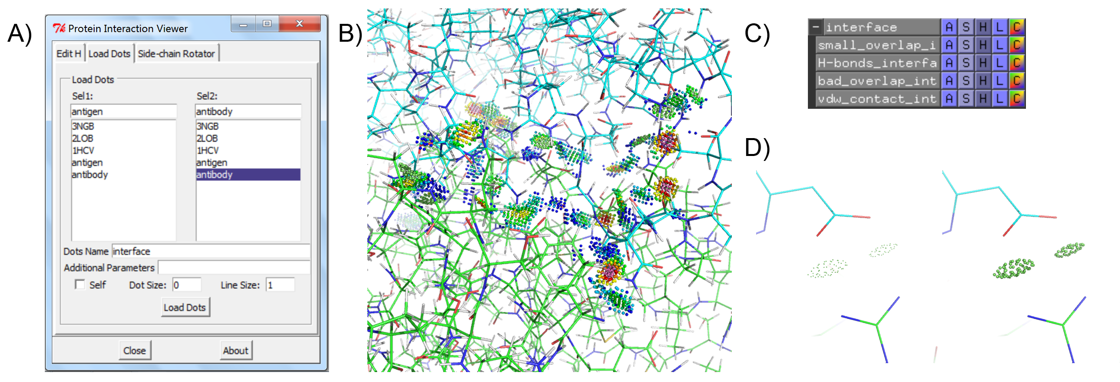 The Richardson Lab has developed a suite of tools for validating protein structure that is made available through the MolProbity server. Of particular interest for visualizing protein interactions is the Probe program, which generates contact dots between protein residues that are close enough to interact with one another. The contact dots visually represent favorable van der Waals interactions, steric clashes, and hydrogen bonding. These visual aids are useful to rapidly identify both favorable interactions and problems with the protein structure, but are only natively available in a limited number of molecular visualization programs. Protein Interaction Viewer is a PyMOL plugin that allows Probe contact dots to be visualized within PyMOL, a widely-used molecular viewer.