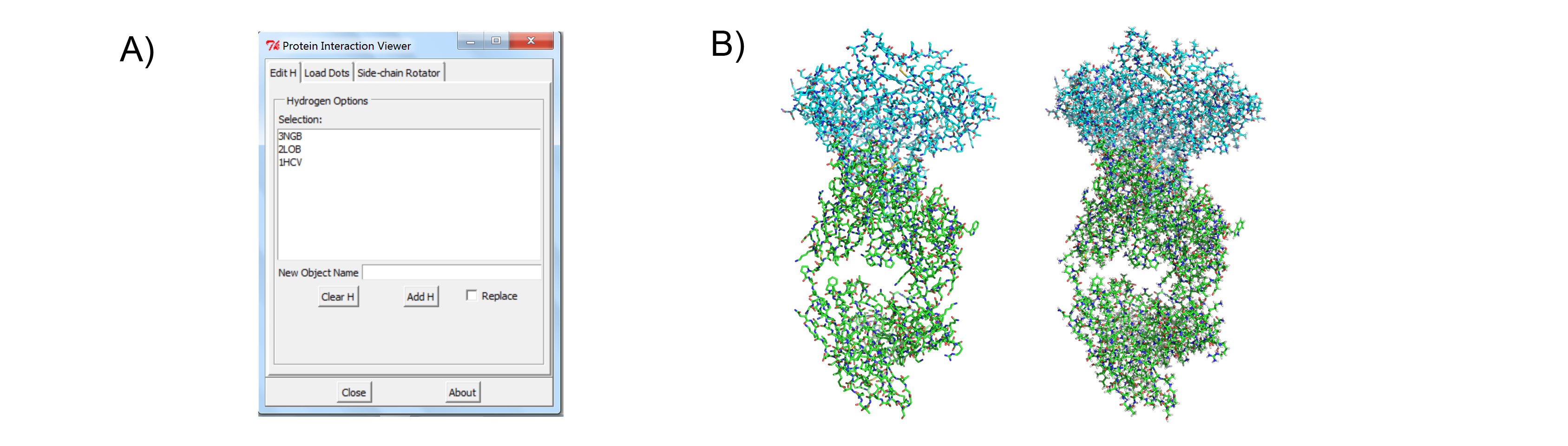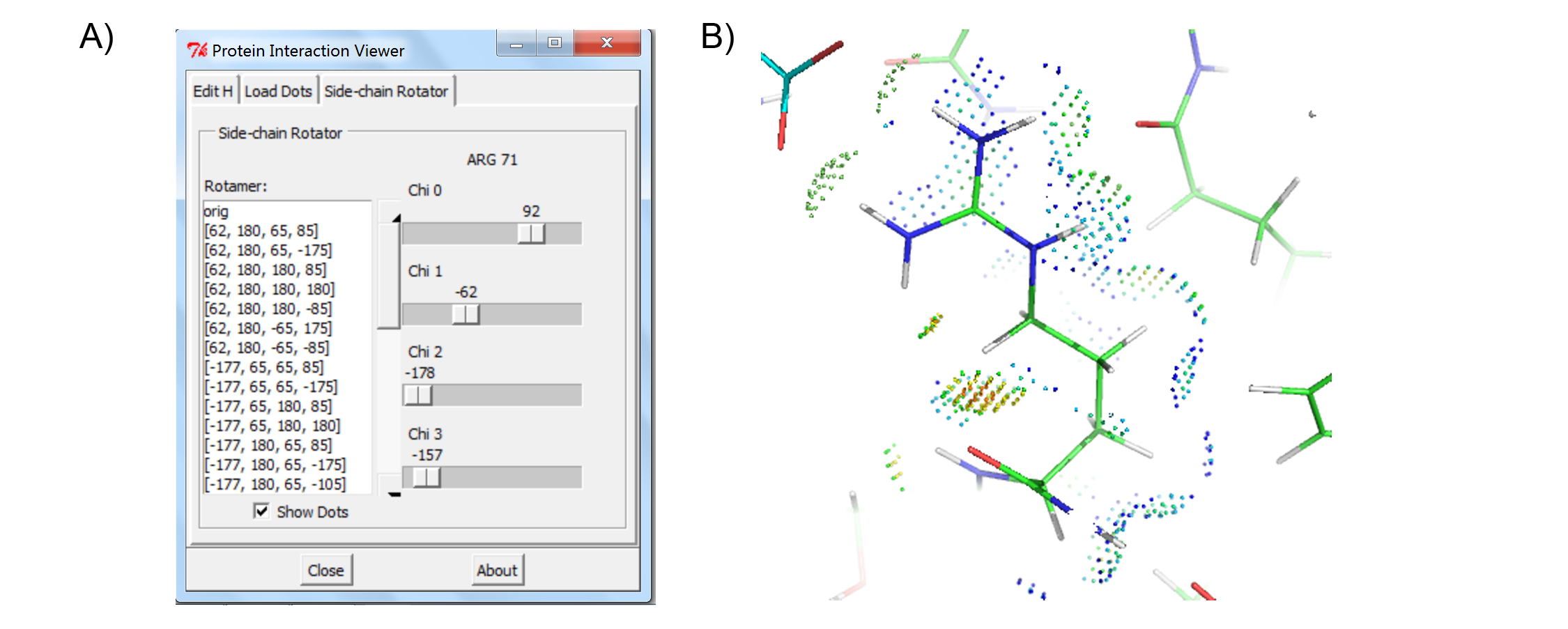 The Protein Interaction Viewer (PIV) PyMOL plugin can carry out three main functions. First, to properly calculate molecular interactions within a protein structure the protein must be fully protonated. PIV provides easy access to the program Reduce that can either add or remove hydrogens from a PDB structure that has been loaded into PyMOL (Figure 1). Second, PIV allows the user to create and visualize contact dots for a single PyMOL selection or between two PyMOL selections (Figure 2). The dots are created as PyMOL CGO objects, one object for each type of contact (i.e. small overlap, H-bond, bad overlap, and vdW interaction). The four objects are all added to the same PyMOL group for convenience. Finally, PIV allows the user to easily rotate any side chain within the protein (Figure 3). While the user is rotating a side-chain, they can enable contact dots between that side-chain and the rest of the protein.